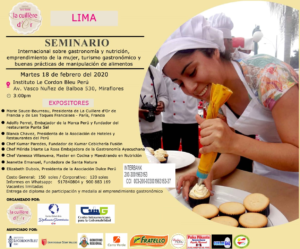 Este 18 de febrero se realizará el Seminario Internacional sobre Emprendimiento, Gastronomía, Turismo Gastronómico, Buenas Prácticas de manipulación de alimentos y nutrición. El evento es organizado por el Centro Global de Diplomacia Gastronómica,el Instituto Le Cordon Bleu Perú, la Asociación Dulce Perú y La Cuillere DOr de Francia.